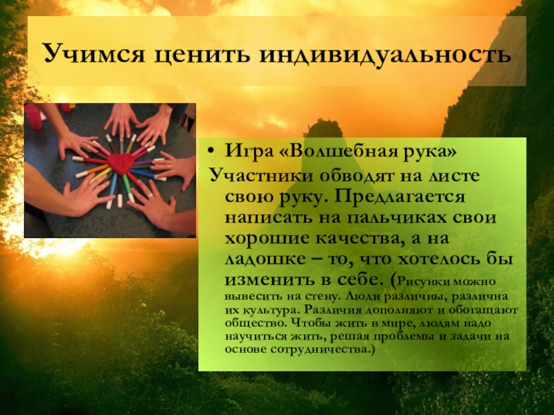 руку. Предлагается написать на пальчиках свои хорошие качества, а на ладошке – то, что хотелось бы изменить в себе. (Рисунки можно вывесить на стену. Люди различны, различна их культура. Различия дополняют и обогащают общество. Чтобы жить в мире, людям надо научиться жить, решая проблемы и задачи на основе сотрудничества.)