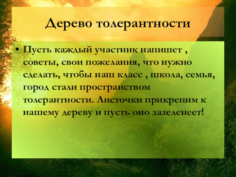 сделать, чтобы наш класс , школа, семья, город стали пространством толерантности. Листочки прикрепим к нашему дереву и пусть оно зазеленеет!