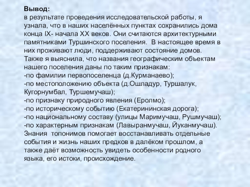 пунктах сохранились дома конца IX- начала XX веков. Они считаются архитектурными памятниками Туршинского поселения. В настоящее время в них проживают люди, поддерживают состояние домов. Также я выяснила, что названия географическим объектам нашего поселения даны по таким признакам: