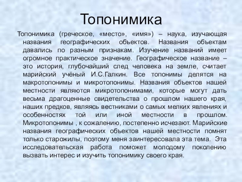 Названия объектам давались по разным признакам. Изучение названий имеет огромное практическое значение. Географическое название – это история, глубочайший след человека на земле, считает марийский учёный И.С.Галкин. Все топонимы делятся на макротопонимы и микротопонимы. Названия объектов нашей местности являются микротопонимами, которые могут дать весьма драгоценные свидетельства о прошлом нашего края, наших предков, являясь вестниками о самых мелких явлениях и особенностях той или иной местности в прошлом. Микротопонимы , к сожалению, постепенно исчезают. Марийские названия географических объектов нашей местности помнят только старожилы, поэтому меня заинтересовала эта тема. Эта исследовательская работа поможет молодому поколению вызвать интерес и изучить топонимику своего края.