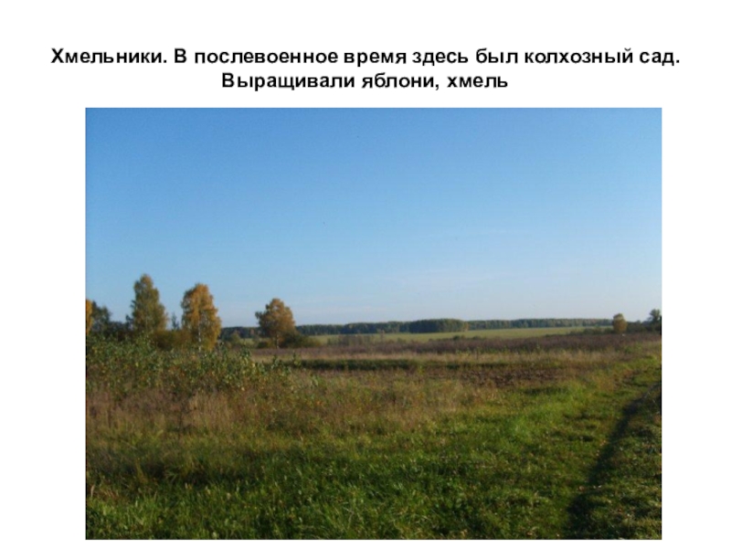 Слайд 25Хмельники. В послевоенное время здесь был колхозный сад. Выращивали яблони, хмель