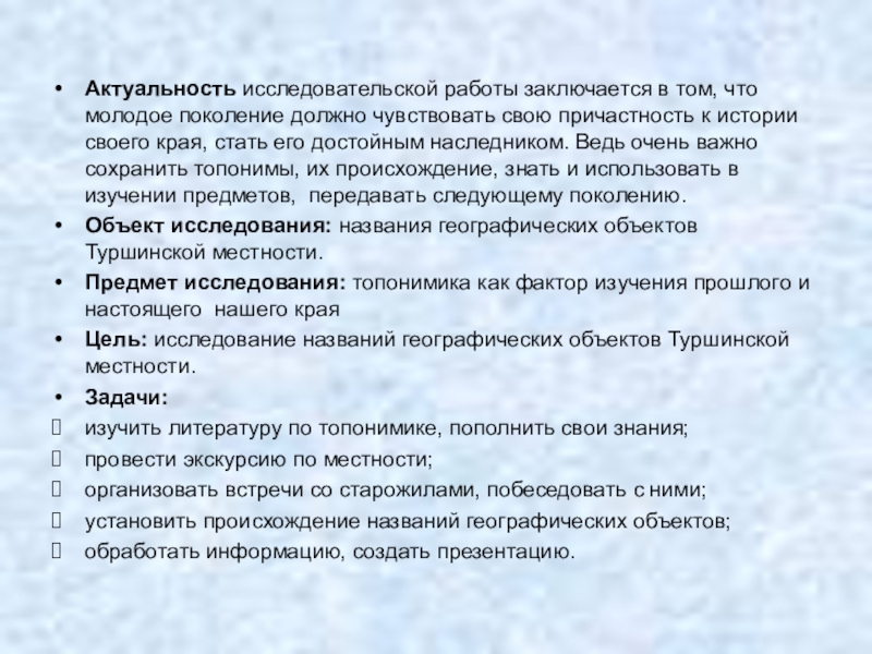 Предмет исследования: топонимика как фактор изучения прошлого и настоящего нашего края