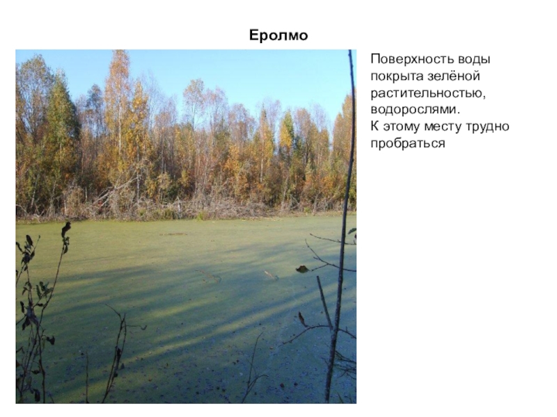 Поверхность воды покрыта зелёной растительностью, водорослями.