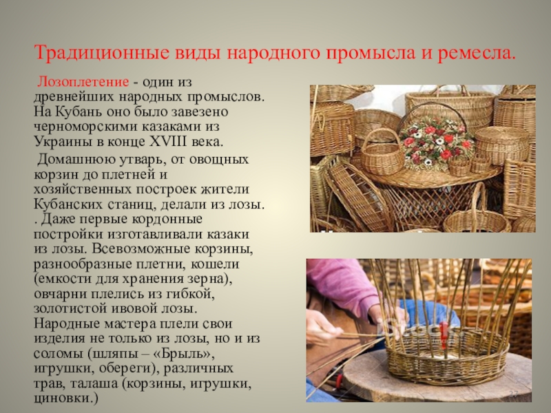 Домашнюю утварь, от овощных корзин до плетней и хозяйственных построек жители Кубанских станиц, делали из лозы. . Даже первые кордонные постройки изготавливали казаки из лозы. Всевозможные корзины, разнообразные плетни, кошели (емкости для хранения зерна), овчарни плелись из гибкой, золотистой ивовой лозы. Народные мастера плели свои изделия не только из лозы, но и из соломы (шляпы – «Брыль», игрушки, обереги), различных трав, талаша (корзины, игрушки, циновки.)