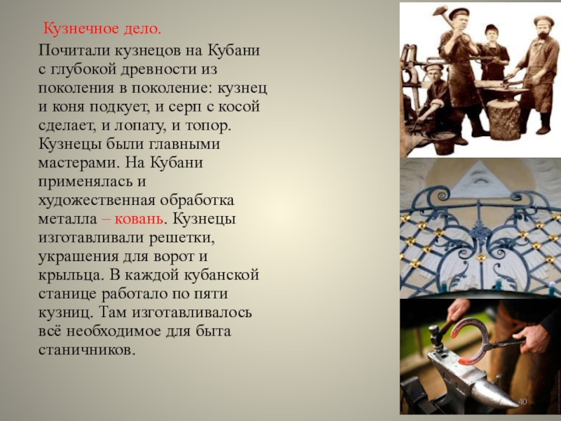 поколения в поколение: кузнец и коня подкует, и серп с косой сделает, и лопату, и топор. Кузнецы были главными мастерами. На Кубани применялась и художественная обработка металла – ковань. Кузнецы изготавливали решетки, украшения для ворот и крыльца. В каждой кубанской станице работало по пяти кузниц. Там изготавливалось всё необходимое для быта станичников.