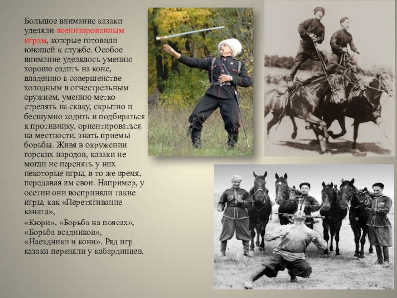 Слайд 33Большое внимание казаки уделяли военизированным играм, которые готовили юношей к службе.