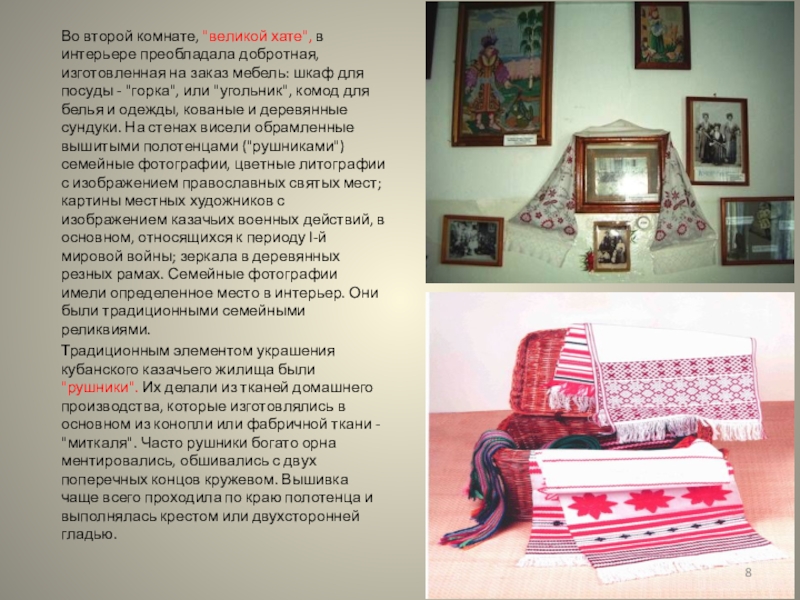 заказ мебель: шкаф для посуды - "горка", или "угольник", комод для белья и одежды, кованые и деревянные сундуки. На стенах висели обрамленные вышитыми полотенцами ("рушниками") семейные фотографии, цветные литографии с изображением православных святых мест; картины местных художников с изображением казачьих военных действий, в основном, относящихся к периоду l-й мировой войны; зеркала в деревянных резных рамах. Семейные фотографии имели определенное место в интерьер. Они были традиционными семейными реликвиями.