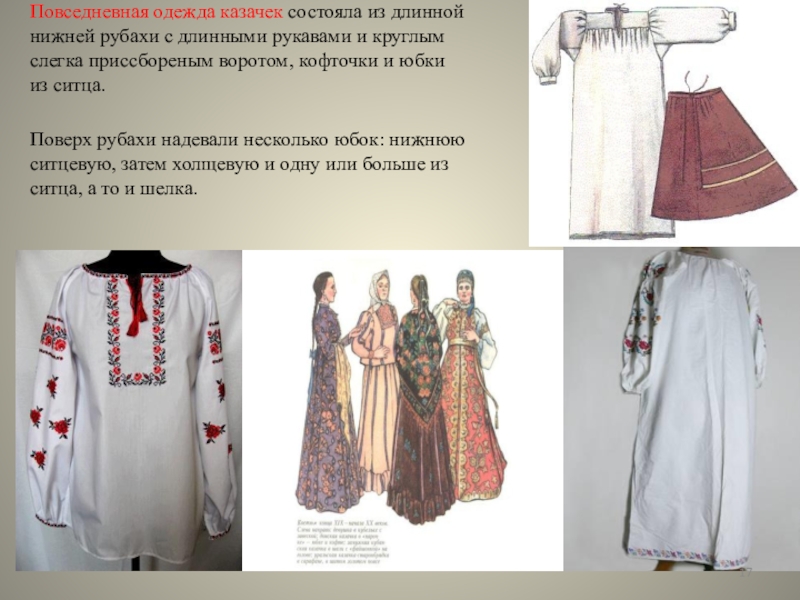 Слайд 17Повседневная одежда казачек состояла из длинной нижней рубахи с длинными рукавами