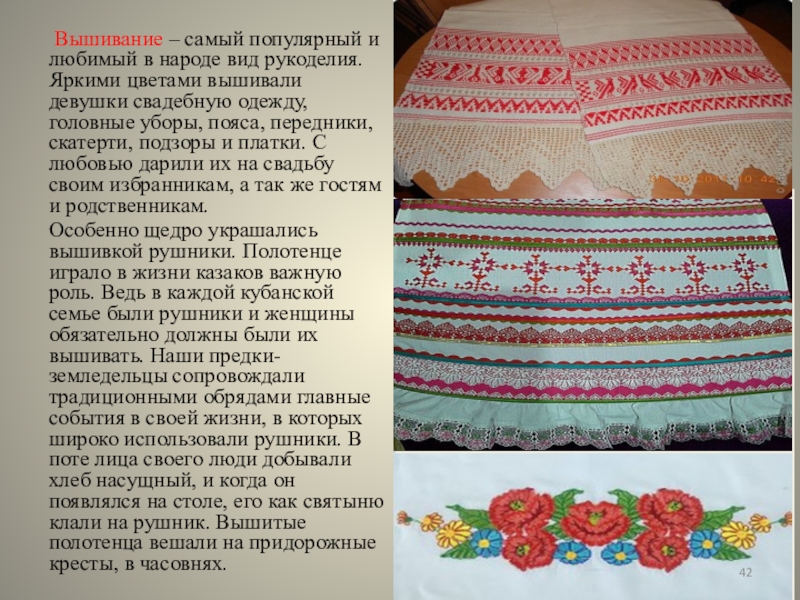 Слайд 42 Вышивание – самый популярный и любимый в народе вид рукоделия.
