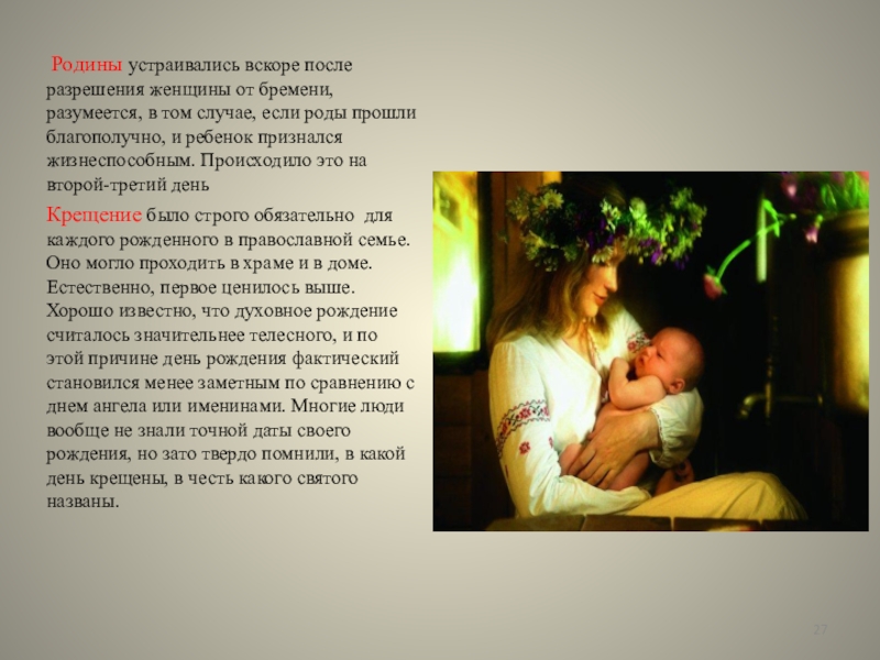 Слайд 27 Родины устраивались вскоре после разрешения женщины от бремени, разумеется, в