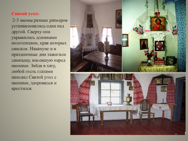 они укрывались длинными полотенцами, края которых свисали. Накануне и в праздничные дни зажигали лампадку, висевшую перед иконами. Зайдя в хату, любой гость глазами находил Святой угол с иконами, здоровался и крестился.