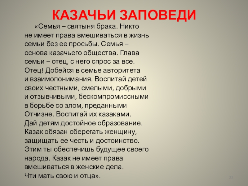 Никто не имеет права вмешиваться в жизнь семьи без ее просьбы. Семья – основа казачьего общества. Глава семьи – отец, с него спрос за все. Отец! Добейся в семье авторитета и взаимопонимания. Воспитай детей своих честными, смелыми, добрыми и отзывчивыми, бескомпромиссными в борьбе со злом, преданными Отчизне. Воспитай их казаками. Дай детям достойное образование. Казак обязан оберегать женщину, защищать ее честь и достоинство. Этим ты обеспечишь будущее своего народа. Казак не имеет права вмешиваться в женские дела. Чти мать свою и отца».