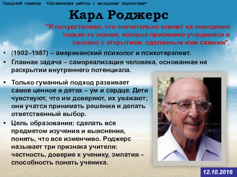 Цель образования: сделать все предметом изучения и выяснения, понять, что все изменчиво. Роджерс называет три признака учителя: честность, доверие к ученику, эмпатия – способность понять ученика.