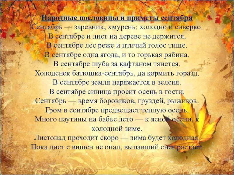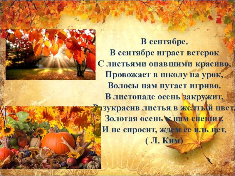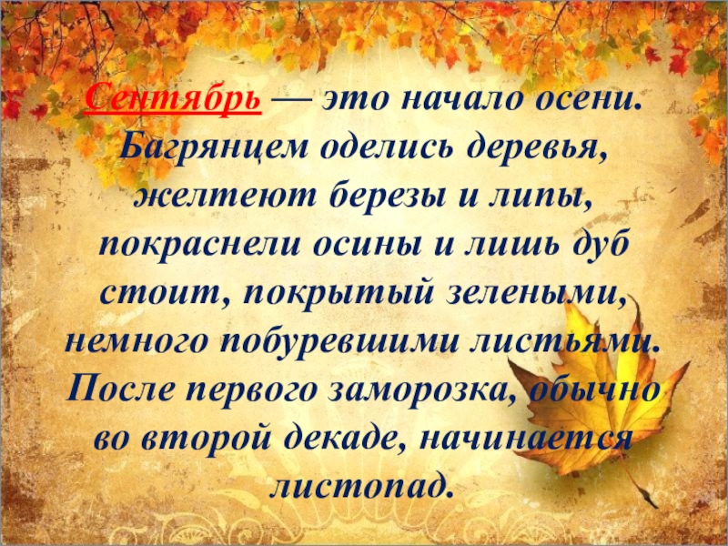 Слайд 3Сентябрь — это начало осени. Багрянцем оделись деревья, желтеют березы и