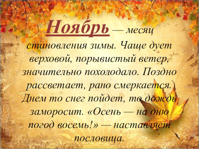 Слайд 12Ноябрь — месяц становления зимы. Чаще дует верховой, порывистый ветер, значительно