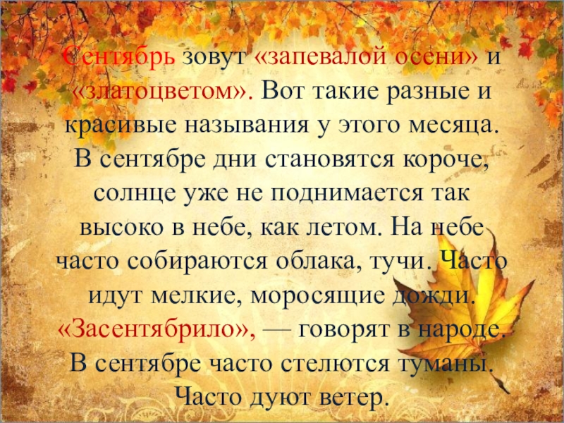 В сентябре дни становятся короче, солнце уже не поднимается так высоко в небе, как летом. На небе часто собираются облака, тучи. Часто идут мелкие, моросящие дожди. «Засентябрило», — говорят в народе. В сентябре часто стелются туманы. Часто дуют ветер.