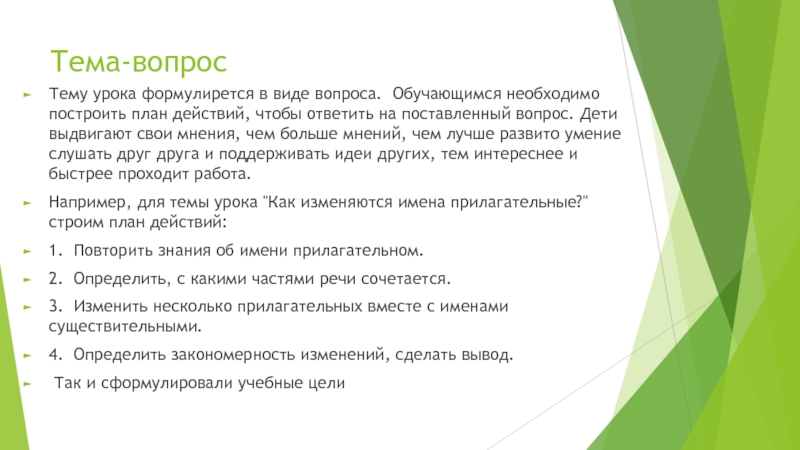 Например, для темы урока "Как изменяются имена прилагательные?" строим план действий: