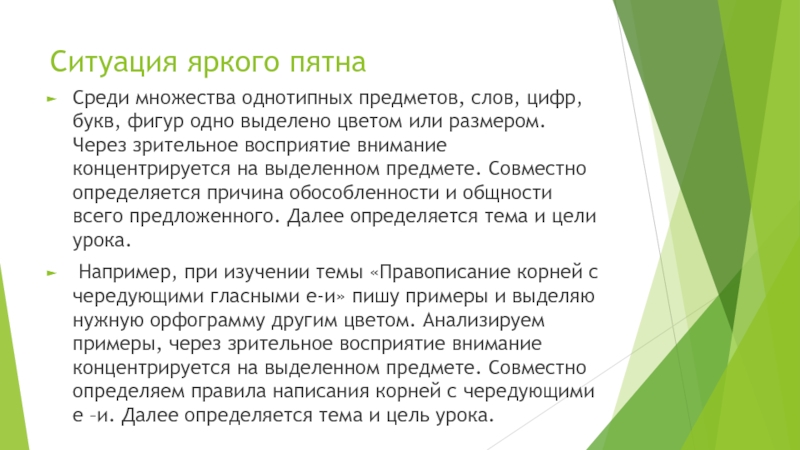 Например, при изучении темы «Правописание корней с чередующими гласными е-и» пишу примеры и выделяю нужную орфограмму другим цветом. Анализируем примеры, через зрительное восприятие внимание концентрируется на выделенном предмете. Совместно определяем правила написания корней с чередующими е –и. Далее определяется тема и цель урока.