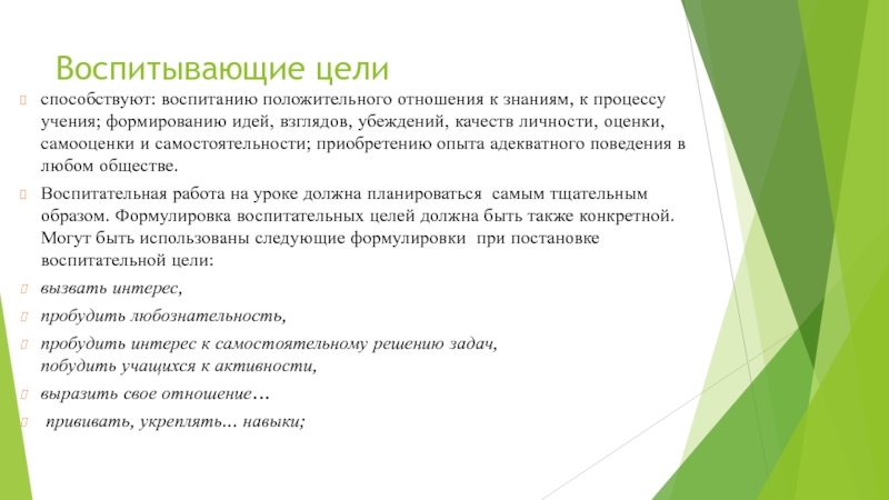 Воспитательная работа на уроке должна планироваться самым тщательным образом. Формулировка воспитательных целей должна быть также конкретной. Могут быть использованы следующие формулировки при постановке воспитательной цели: