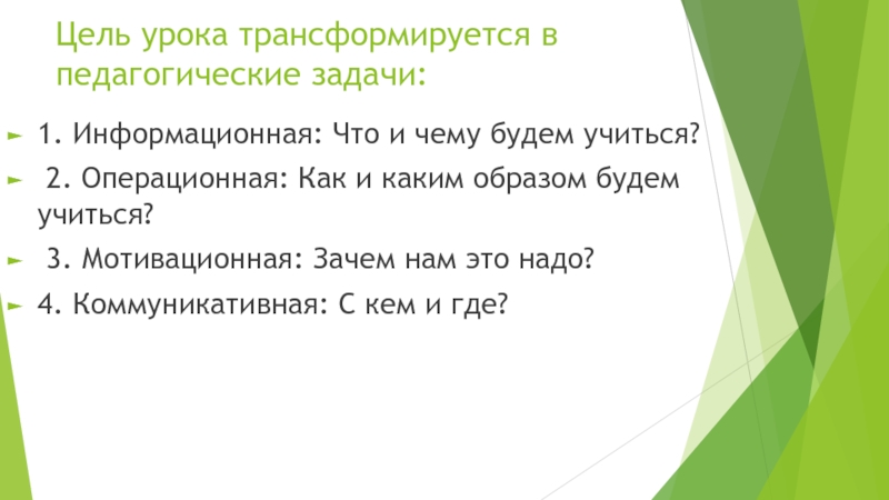 Слайд 10Цель урока трансформируется в педагогические задачи: