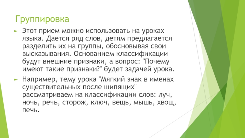 Например, тему урока "Мягкий знак в именах существительных после шипящих" рассматриваем на классификации слов: луч, ночь, речь, сторож, ключ, вещь, мышь, хвощ, печь.