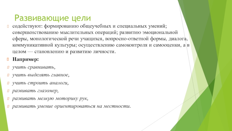 содействуют: формированию общеучебных и специальных умений; совершенствованию мыслительных операций; развитию