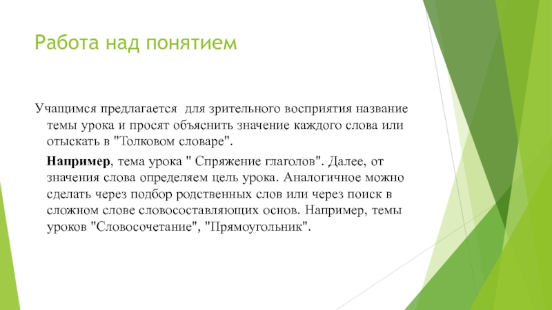 Например, тема урока " Спряжение глаголов". Далее, от значения слова определяем цель урока. Аналогичное можно сделать через подбор родственных слов или через поиск в сложном слове словосоставляющих основ. Например, темы уроков "Словосочетание", "Прямоугольник".