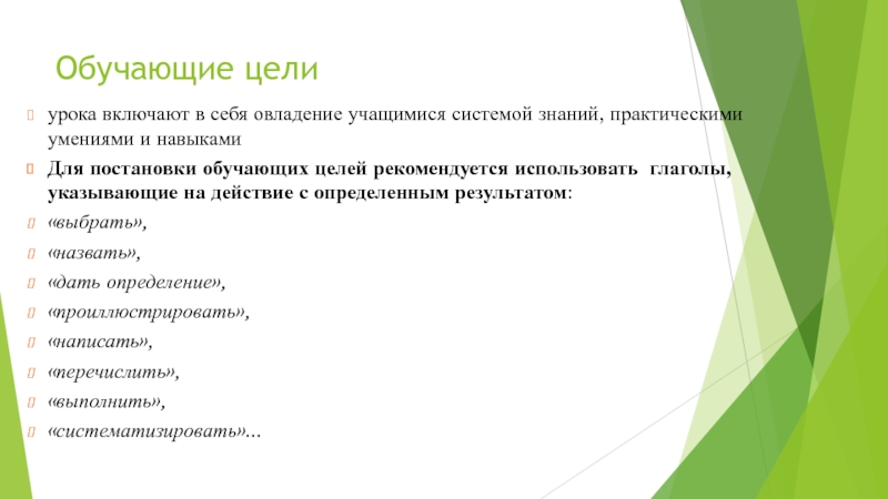 Для постановки обучающих целей рекомендуется использовать глаголы, указывающие на действие с определенным результатом: