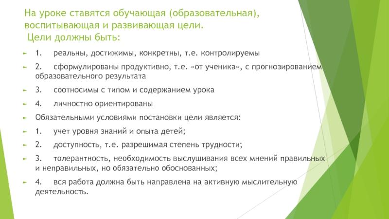 Слайд 6На уроке ставятся обучающая (образовательная), воспитывающая и развивающая цели.