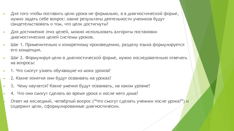 Ответ на последний, четвёртый вопрос (“Что смогут сделать ученики после урока?”) и содержит цели, сформулированные диагностически.