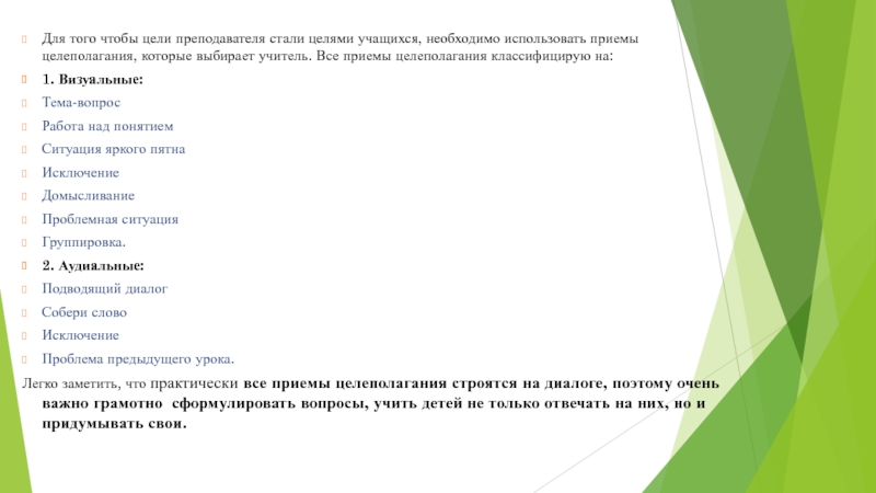 Легко заметить, что практически все приемы целеполагания строятся на диалоге, поэтому очень важно грамотно сформулировать вопросы, учить детей не только отвечать на них, но и придумывать свои.