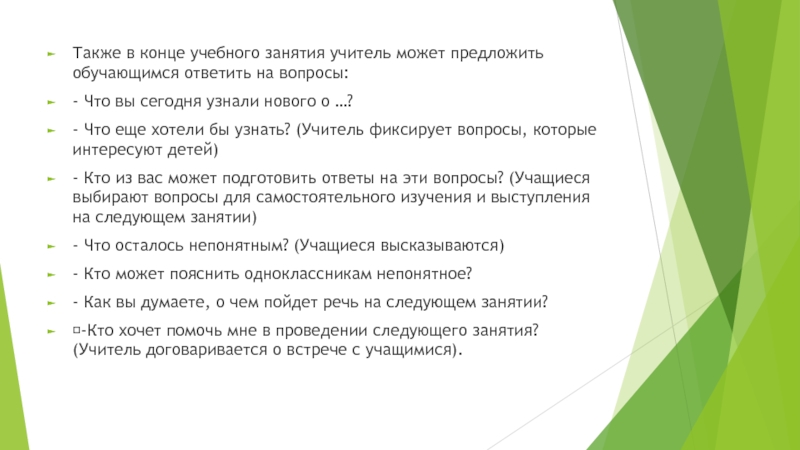Слайд 21Также в конце учебного занятия учитель может предложить обучающимся ответить на