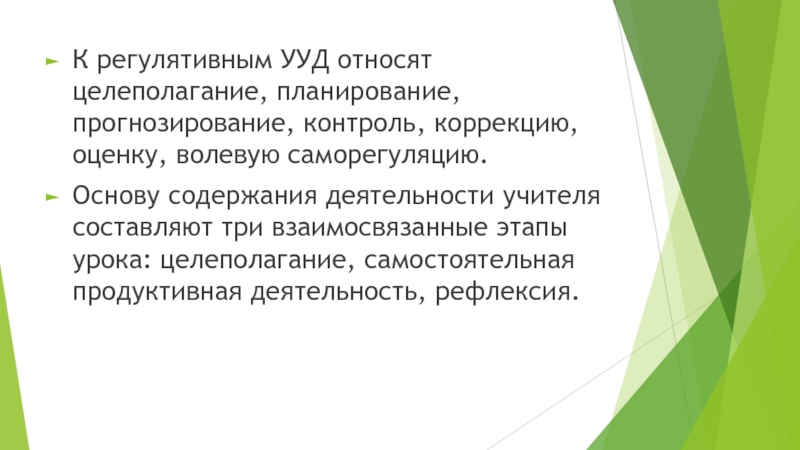 Слайд 3К регулятивным УУД относят целеполагание, планирование, прогнозирование, контроль, коррекцию, оценку, волевую