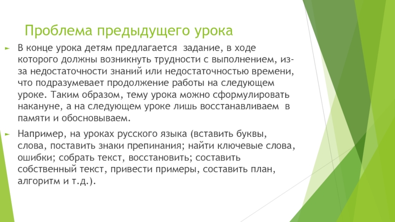 должны возникнуть трудности с выполнением, из-за недостаточности знаний или недостаточностью времени, что подразумевает продолжение работы на следующем уроке. Таким образом, тему урока можно сформулировать накануне, а на следующем уроке лишь восстанавливаем в памяти и обосновываем.