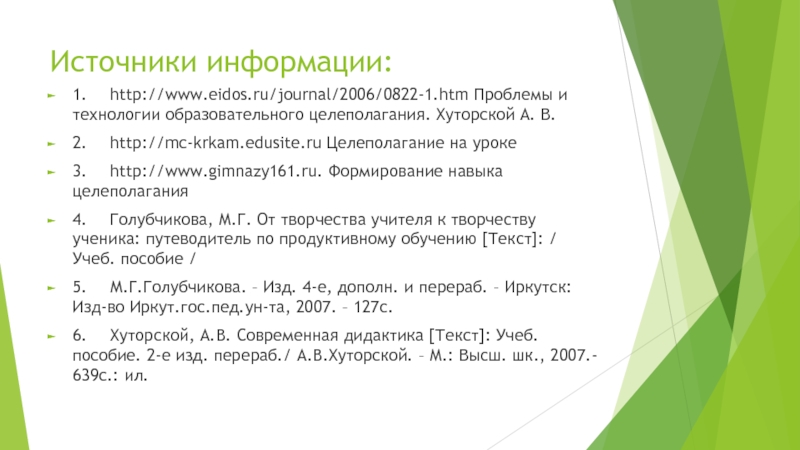 1. http://www.eidos.ru/journal/2006/0822-1.htm Проблемы и технологии образовательного целеполагания. Хуторской А. В.