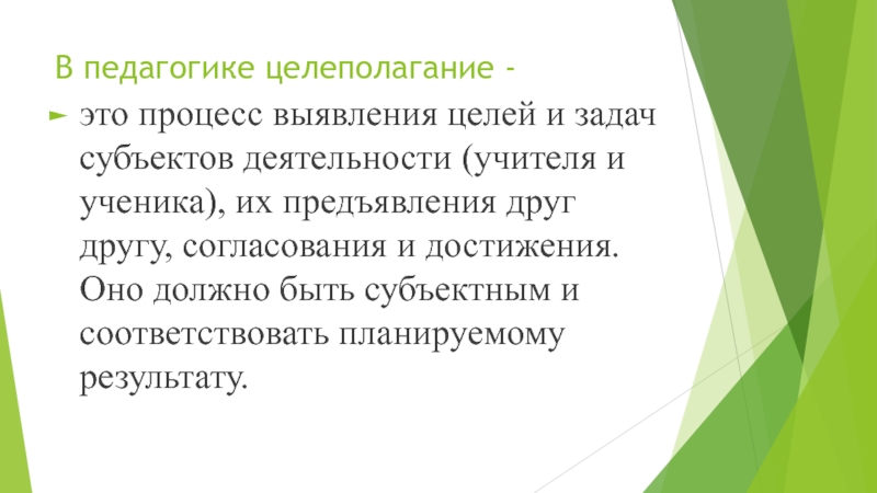 (учителя и ученика), их предъявления друг другу, согласования и достижения. Оно должно быть субъектным и соответствовать планируемому результату.