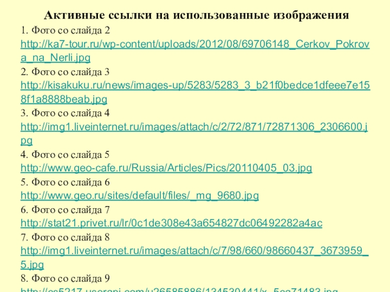 Активные ссылки на использованные изображения1. Фото со слайда 2http://ka7-tour.ru/wp-content/uploads/2012/08/69706148_Cerkov_Pokrova_na_Nerli.jpg 2. Фото со слайда 3http://kisakuku.ru/news/images-up/5283/5283_3_b21f0bedce1dfeee7e158f1a8888beab.jpg 3. Фото со