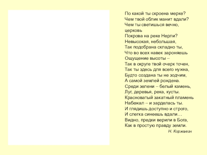 По какой ты скроена мерке?Чем твой облик манит вдали?Чем ты светишься вечно, церковьПокрова на реке Нерли?Невысокая, небольшая,Так