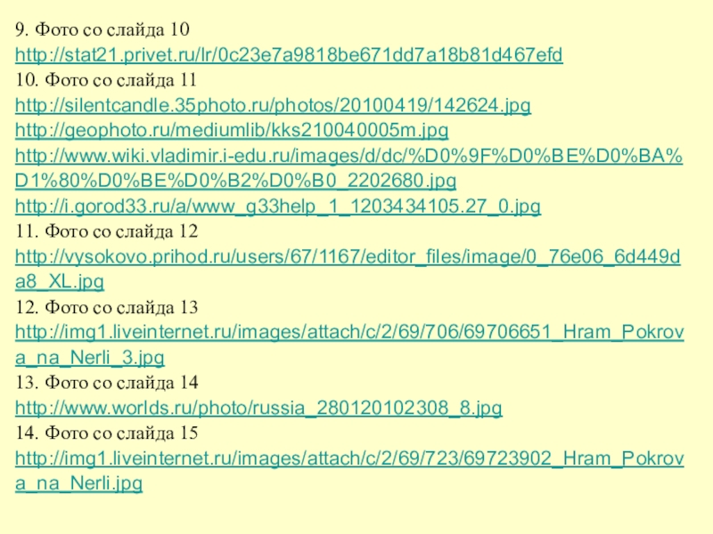 9. Фото со слайда 10http://stat21.privet.ru/lr/0c23e7a9818be671dd7a18b81d467efd 10. Фото со слайда 11http://silentcandle.35photo.ru/photos/20100419/142624.jpg http://geophoto.ru/mediumlib/kks210040005m.jpg http://www.wiki.vladimir.i-edu.ru/images/d/dc/%D0%9F%D0%BE%D0%BA%D1%80%D0%BE%D0%B2%D0%B0_2202680.jpghttp://i.gorod33.ru/a/www_g33help_1_1203434105.27_0.jpg 11. Фото со слайда 12