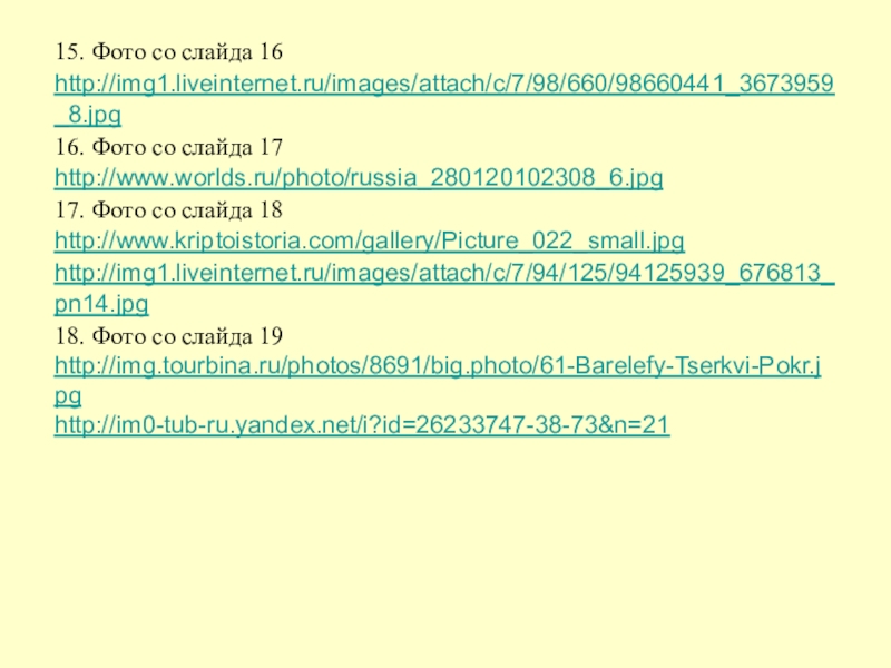 15. Фото со слайда 16http://img1.liveinternet.ru/images/attach/c/7/98/660/98660441_3673959_8.jpg 16. Фото со слайда 17 http://www.worlds.ru/photo/russia_280120102308_6.jpg 17. Фото со слайда 18 http://www.kriptoistoria.com/gallery/Picture_022_small.jpg