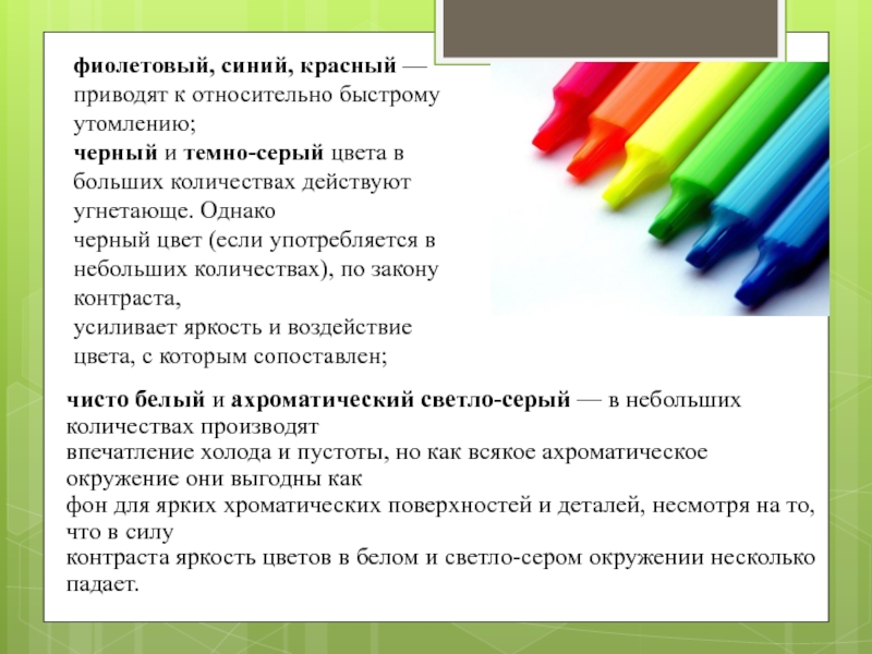 фиолетовый, синий, красный — приводят к относительно быстрому утомлению;