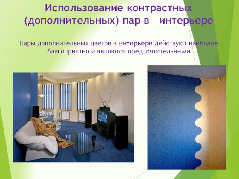 В круге Иттена, эти цвета стоят напротив друг друга. Это наиболее сбалансированный контраст, так как вместе дополнительные цвета достигают «золотой середины» (белого), но проблема заключается в том, что они не могут создать ни движения, ни достижения цели. Поэтому эти сочетания редко используется в повседневности, так как создают впечатление накала страстей, а в таком состоянии тяжело находиться долго.