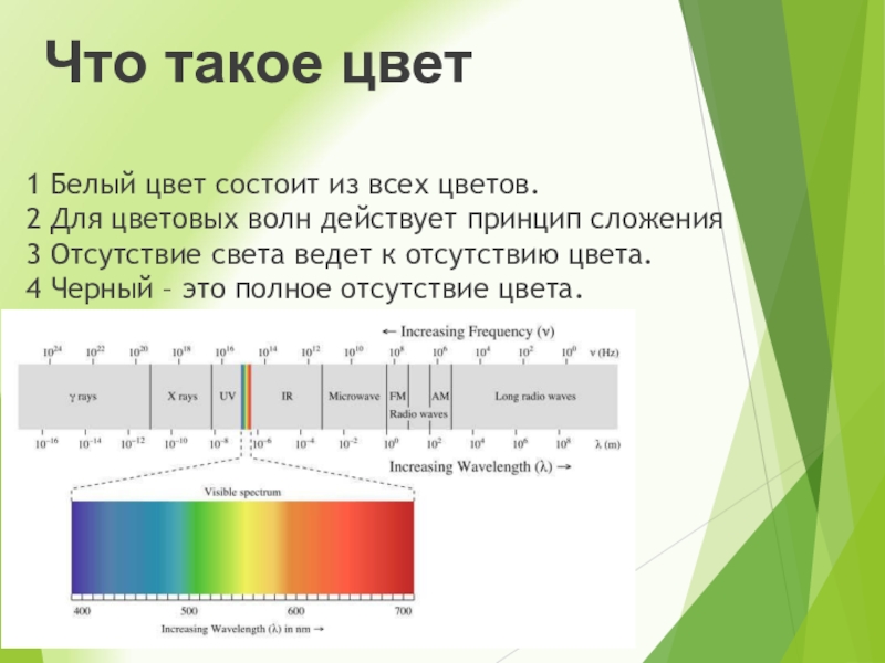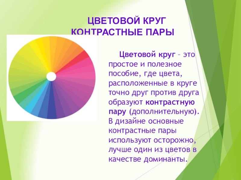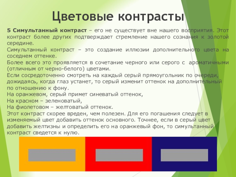 4 Контраст дополнительных цветов. Дополнительными называют цвета, при смешивании которых получается серый цвет. Если смешивать спектры дополнительных цветов, то получается белый цвет.