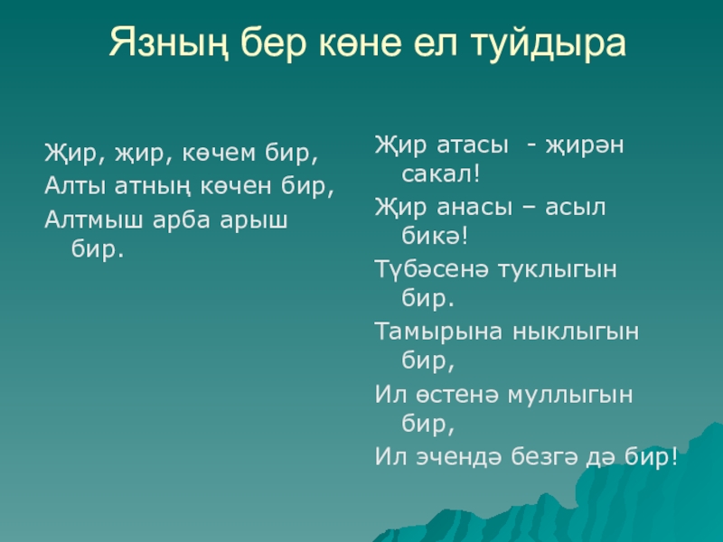 Татар кешесе! Тирә - ягыңа кара! Үзең яшәгән җирнең кадерен бел, аны киләчәк буыннарга пычранмаган килеш тапшыр.