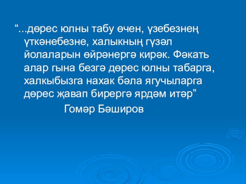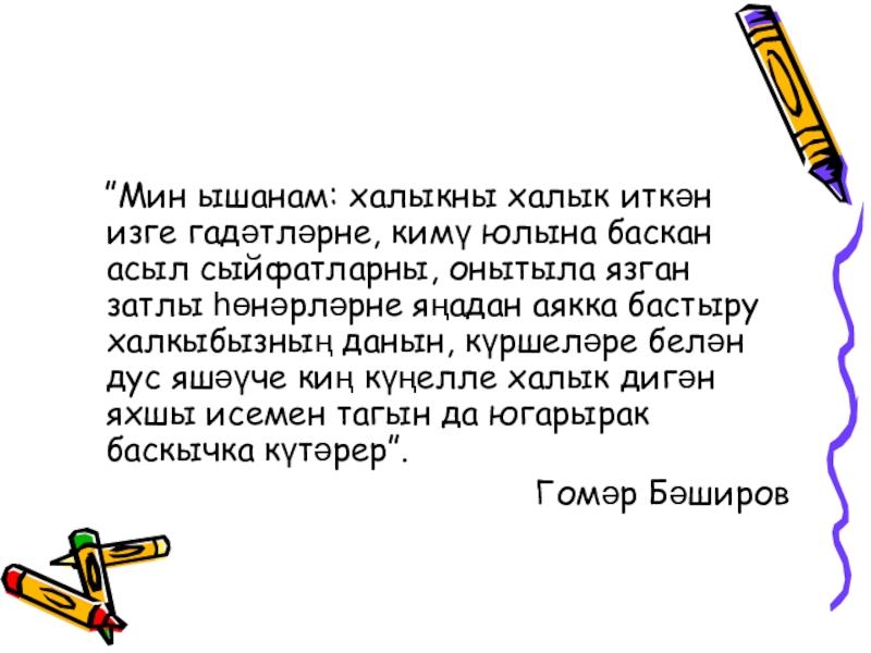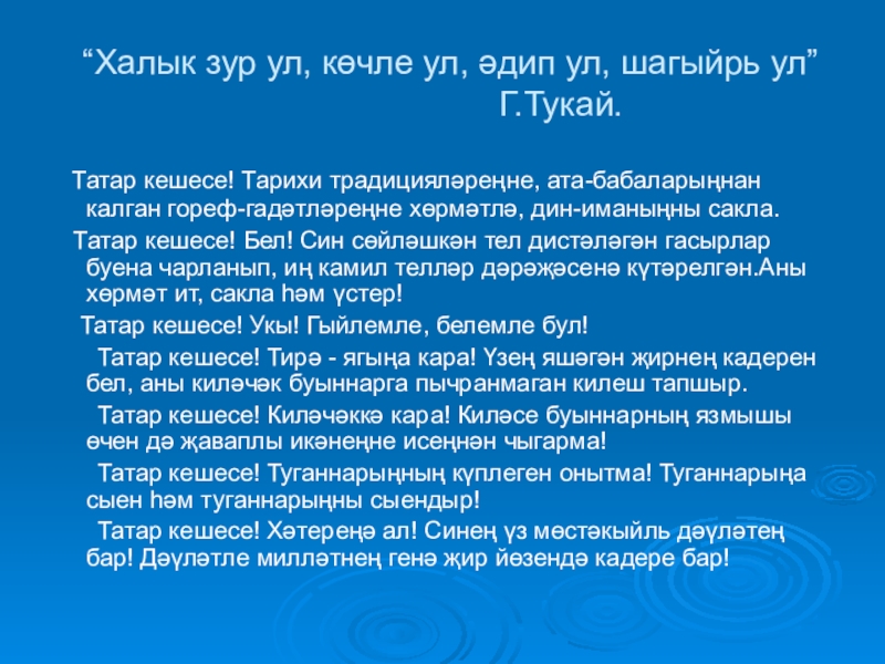 Татар кешесе! Бел! Син сөйләшкән тел дистәләгән гасырлар буена чарланып, иң камил телләр дәрәҗәсенә күтәрелгән.Аны хөрмәт ит, сакла һәм үстер!