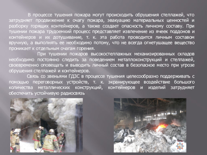 При тушении пожаров высокостеллажных механизированных складов необходимо постоянно следить за поведением металлоконструкций и стеллажей, своевременно оповещать и выводить личный состав в безопасное место при угрозе обрушения стеллажей и контейнеров.
