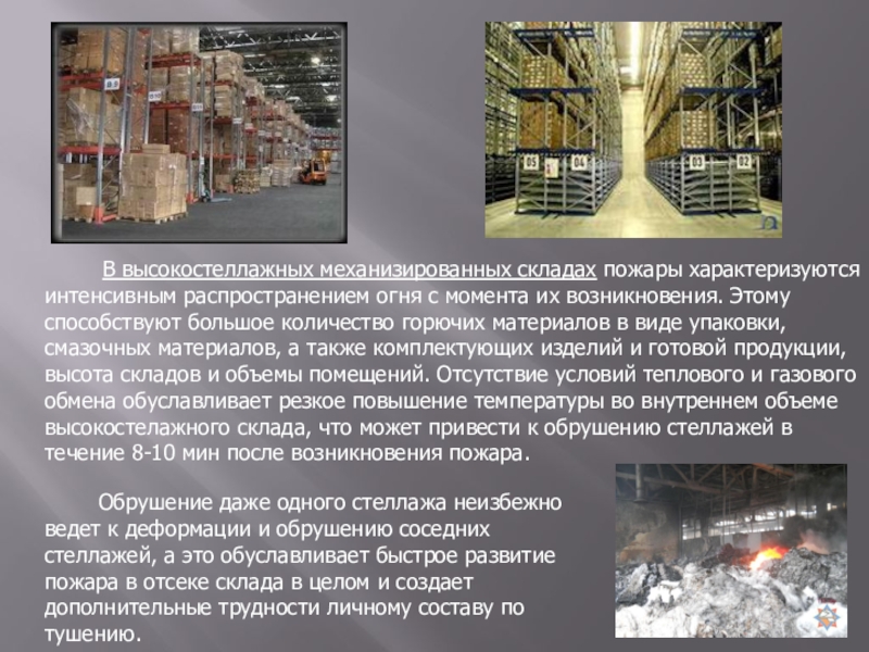 Обрушение даже одного стеллажа неизбежно ведет к деформации и обрушению соседних стеллажей, а это обуславливает быстрое развитие пожара в отсеке склада в целом и создает дополнительные трудности личному составу по тушению.