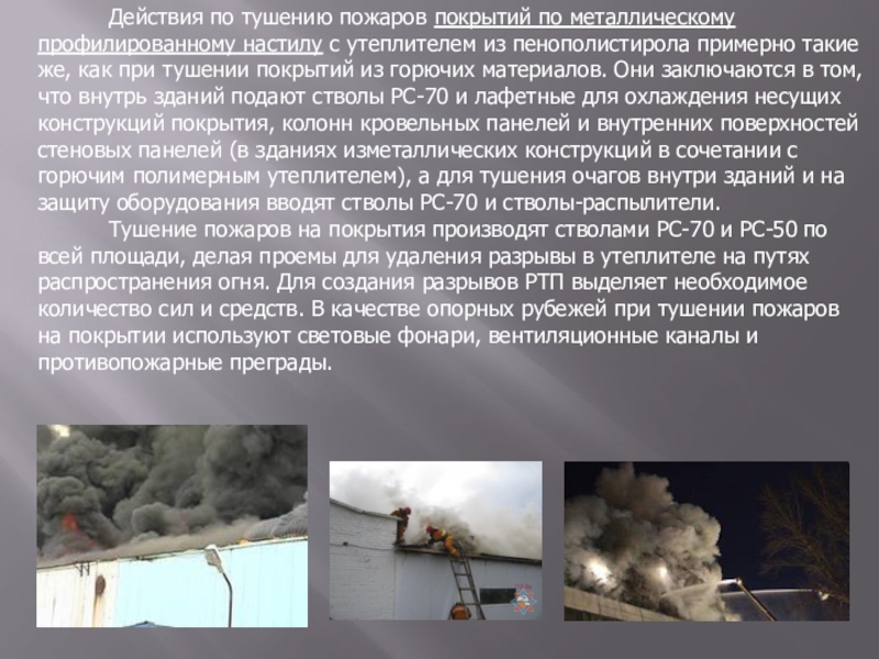 настилу с утеплителем из пенополистирола примерно такие же, как при тушении покрытий из горючих материалов. Они заключаются в том, что внутрь зданий подают стволы РС-70 и лафетные для охлаждения несущих конструкций покрытия, колонн кровельных панелей и внутренних поверхностей стеновых панелей (в зданиях изметаллических конструкций в сочетании с горючим полимерным утеплителем), а для тушения очагов внутри зданий и на защиту оборудования вводят стволы РС-70 и стволы-распылители.