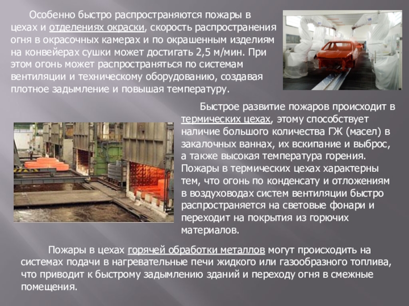 Особенно быстро распространяются пожары в цехах и отделениях окраски, скорость распространения огня в окрасочных камерах и по окрашенным изделиям на конвейерах сушки может достигать 2,5 м/мин. При этом огонь может распространяться по системам вентиляции и техническому оборудованию, создавая плотное задымление и повышая температуру.