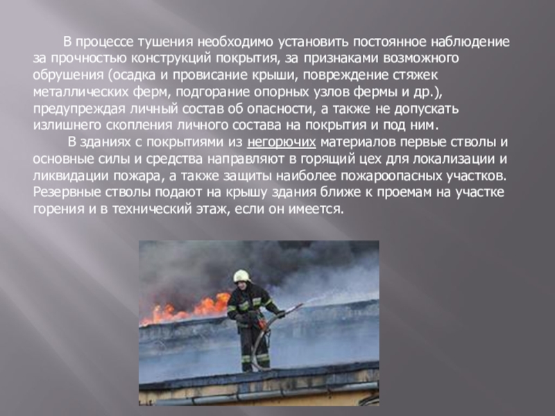 за прочностью конструкций покрытия, за признаками возможного обрушения (осадка и провисание крыши, повреждение стяжек металлических ферм, подгорание опорных узлов фермы и др.), предупреждая личный состав об опасности, а также не допускать излишнего скопления личного состава на покрытия и под ним.